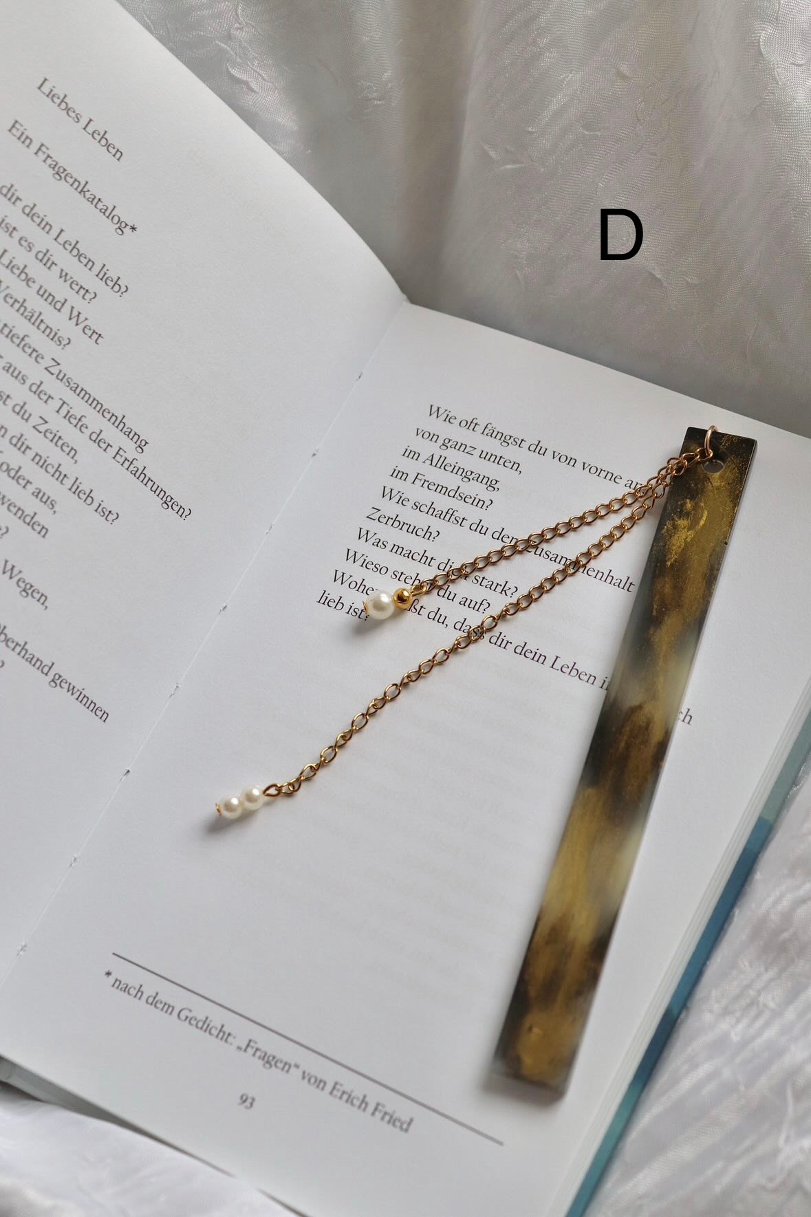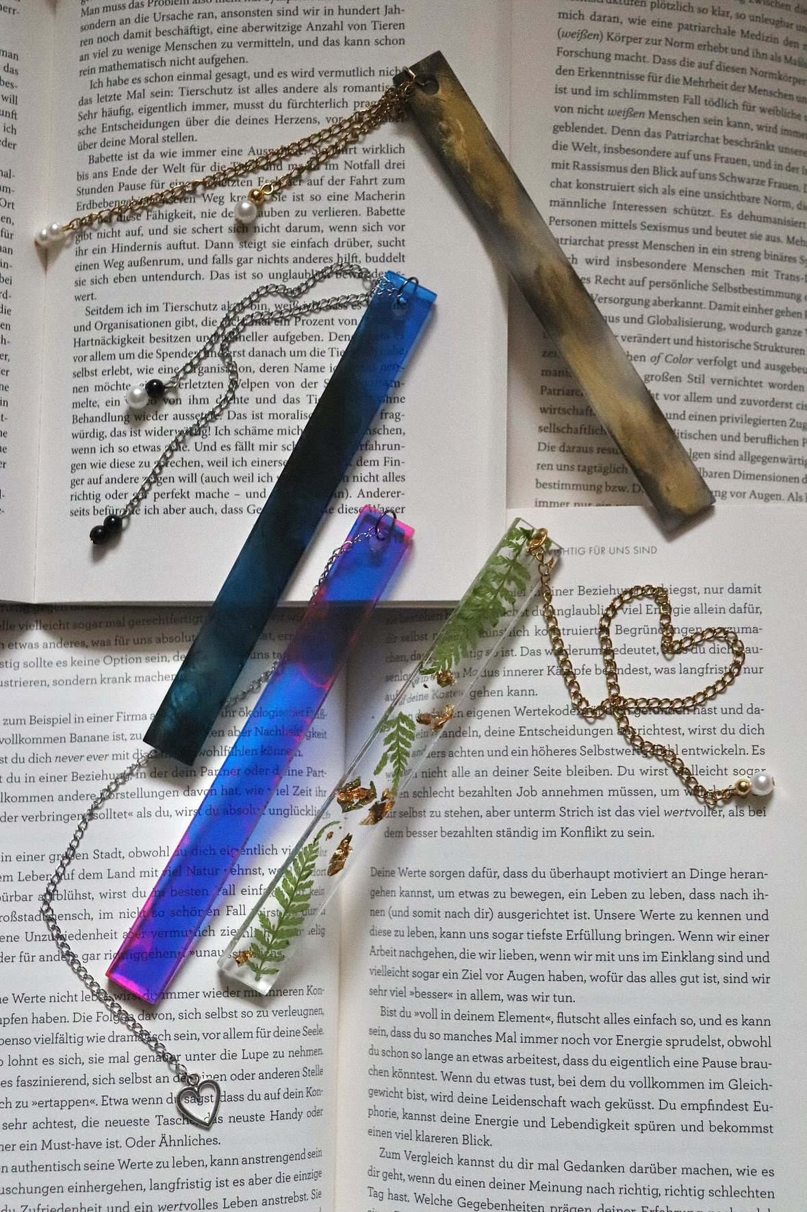 lesezeichen aus epoxidharz + ggf. echte getrocknete pflanzenteile, ketten aus edelstahl. bei allergien oder hautirritationen nicht weiterverwenden, ggf. ärztlichen rat einholen. nicht geeignet für kinder unter 3 jahren (verschluckbare kleinteile). starken druck vermeiden: bruch- und reißgefahr. kontakt mit wasser, parfüm, chemikalien vermeiden, um lebensdauer des produktes zu verlängern.